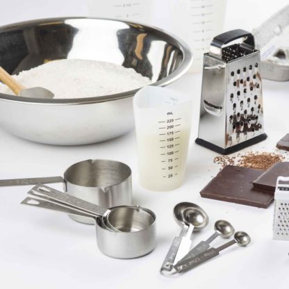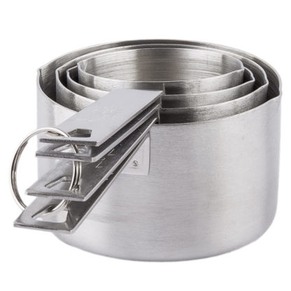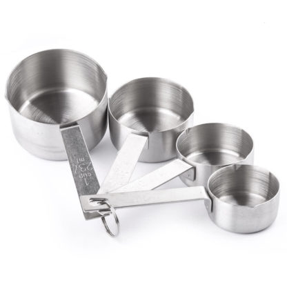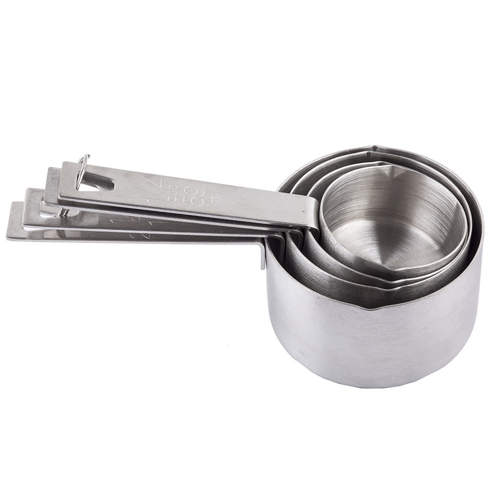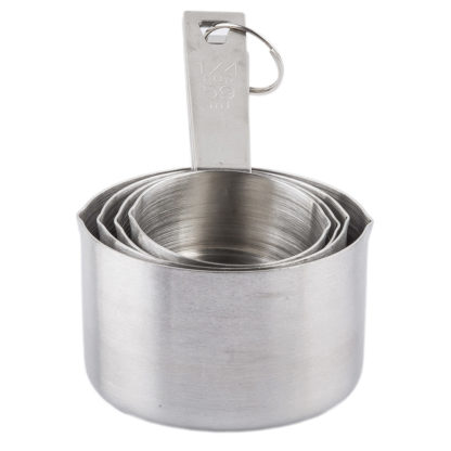 The Tablecraft 725 measuring cup set contains four cups of various measurements that have capacities of 1/4 cup, 1/2 cup, 1/3 cup, 1/2 cup, and 1 cup, so users can accurately measure a variety of ingredients. For enough durability to withstand frequent use, the cups are made of stainless steel.