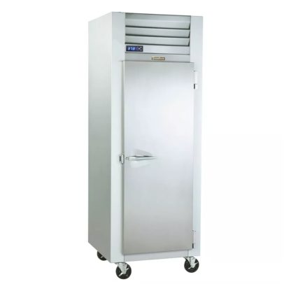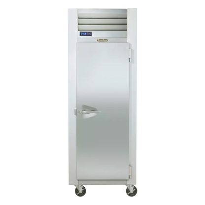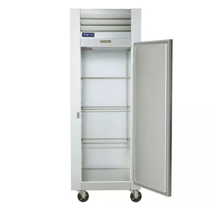 The temperature in this Traulsen G10010 single-section reach-in refrigerator stays between 34 and 38 degrees Fahrenheit; the operator can set this level to suit specific applications on the microprocessor control. This control system is resistant to damage from water and has an LED display that shows the temperature in Fahrenheit or Celsius. Self-contained, the refrigeration system is mounted on top of the unit. With this design, all the parts are built together and accessible for servicing behind the louver assembly. The evaporator sits out of the food zone, so it does not take up space where product can be stored.