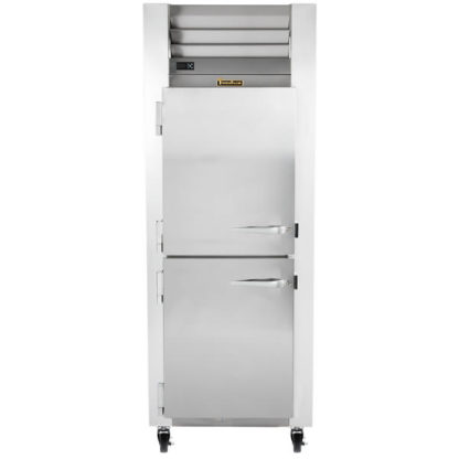 The Traulsen G12001 one-section reach-in freezer comes with three epoxy-coated shelves that have a wire design, utilizing gaps to promote even, complete air circulation. A guard in the cabinet also encourages air to flow through the designed path. Preventing users from storing items too close to the wall and disrupting airflow, this piece is built into the wall. Half doors on the unit separate the cabinet into smaller sections than units with one full door, minimizing cold air loss when a door is opened. The door self-closes to prevent cold air from escaping rapidly, while the stay-open feature at 120 degrees ensures loading items is convenient.