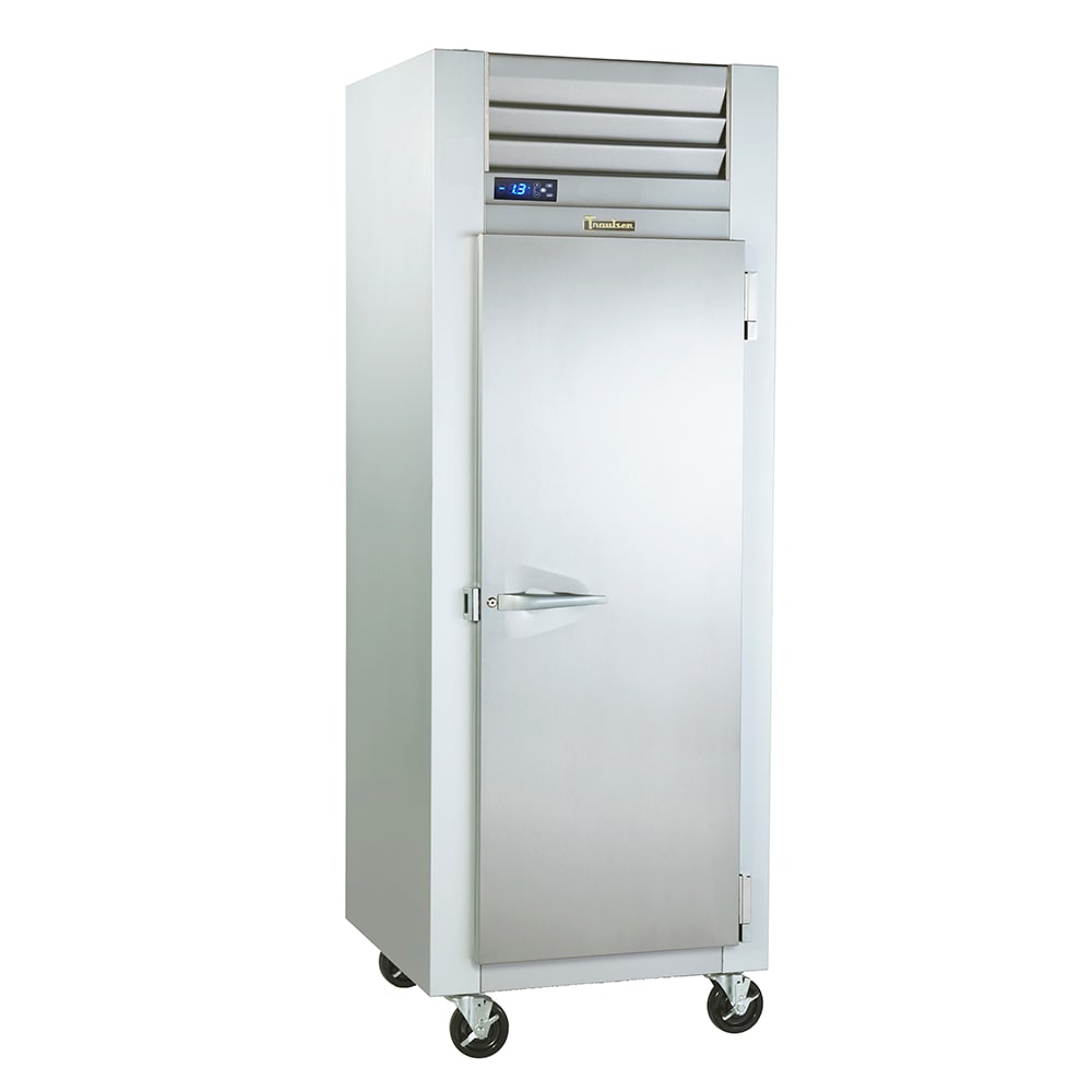 The refrigeration system in this Traulsen G12010-032 single-section reach-in freezer is mounted in the top, positioned away from dirt and flour on the floor. While this position does make the components harder to access than bottom-mounted systems, the louver has a one-piece design for convenient removal. So users can conveniently clean the coil, the condenser faces forward. Temperatures in this unit are adjustable from -5 to 0 degrees Fahrenheit, and the operator can set it at -10 degrees Fahrenheit for specific products.