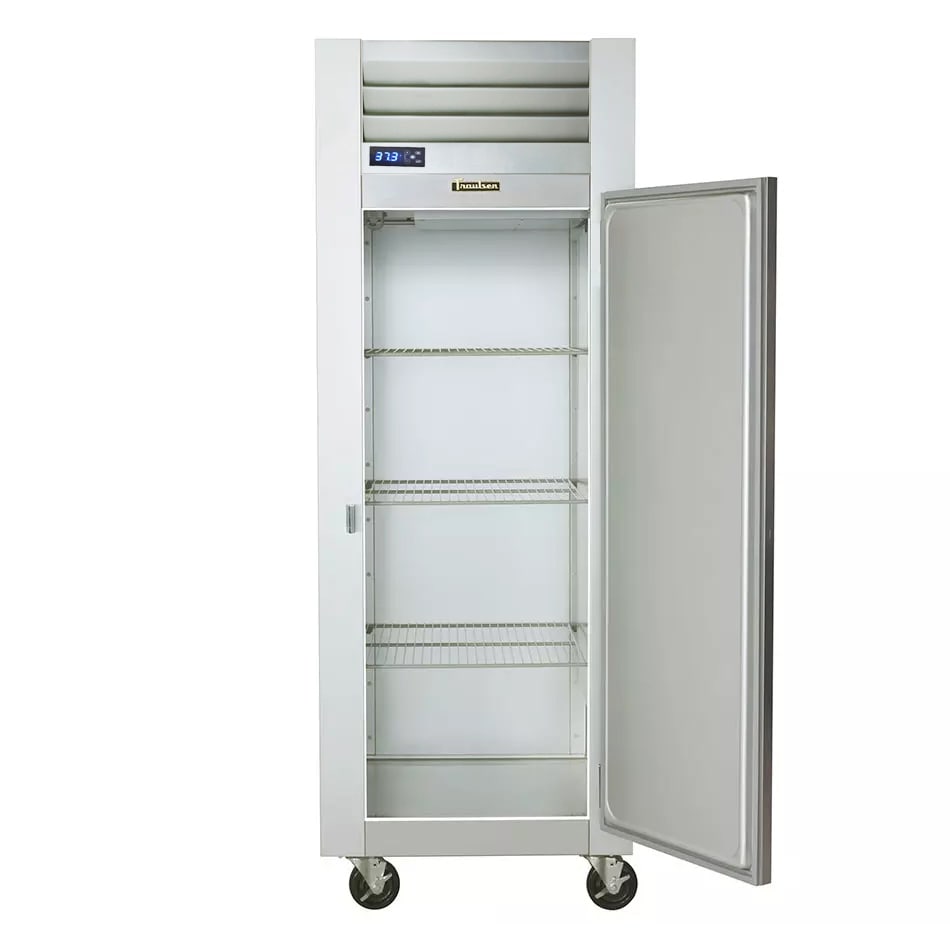 The Traulsen G12010 single-section reach-in freezer comes with three shelves in its cabinet; their epoxy coating provides corrosion resistance for lasting strength. A guard prevents items from being stored too close to the wall and disrupting the airflow path, and LED lights ensure they are fully visible. Because the cabinet is made completely of metal, it withstands heavy use. Polyurethane insulation and door gaskets prevent cold air from leaking out. Because the door has a stay-open feature, it remains in an open position while users load product into the cabinet.