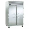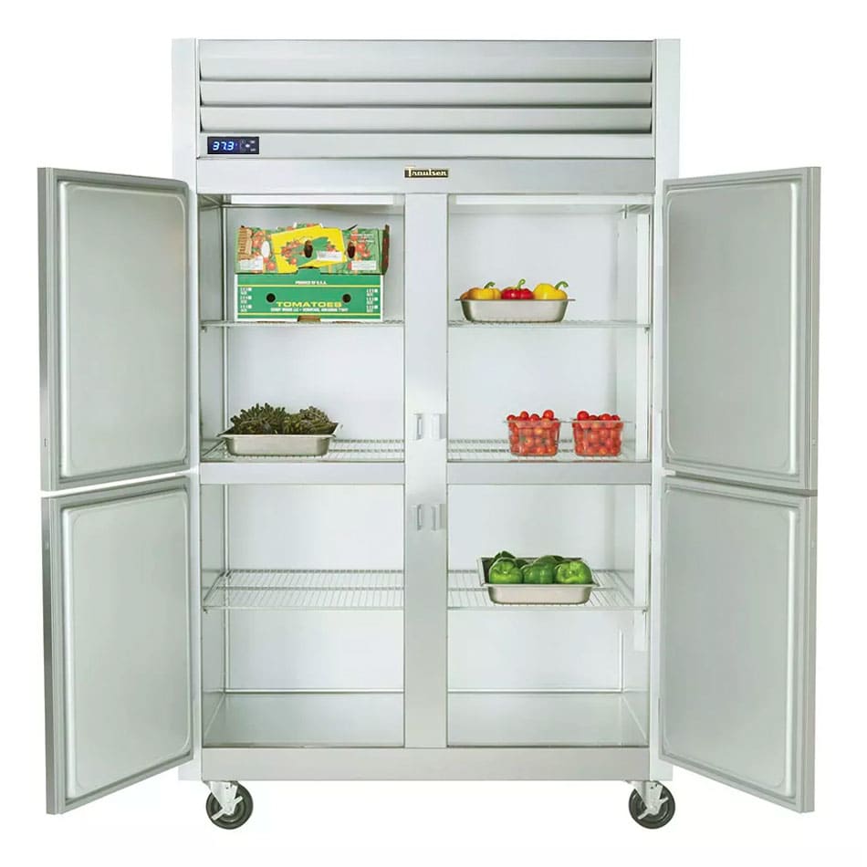 This Traulsen G20000 reach-in refrigerator has thick polyurethane foam in its walls, which reinforces and insulates the cabinet. Gaskets fill in gaps around the doors, reducing how much heat escapes, and the doors close by themselves to prevent product spoilage. Each door is half-size, so users can familiarize themselves with the contents in each section and only expose a small portion of the interior to the outside air. The unit can be programmed to operate at a set temperature between 34 and 38 degrees Fahrenheit, and users can monitor the settings on a microprocessor controller. Its built-in refrigeration system has a responsive thermal expansion valve. Whenever the temperature gets too hot, this valve expands to increase refrigerant flow and quickly cool down the interior.