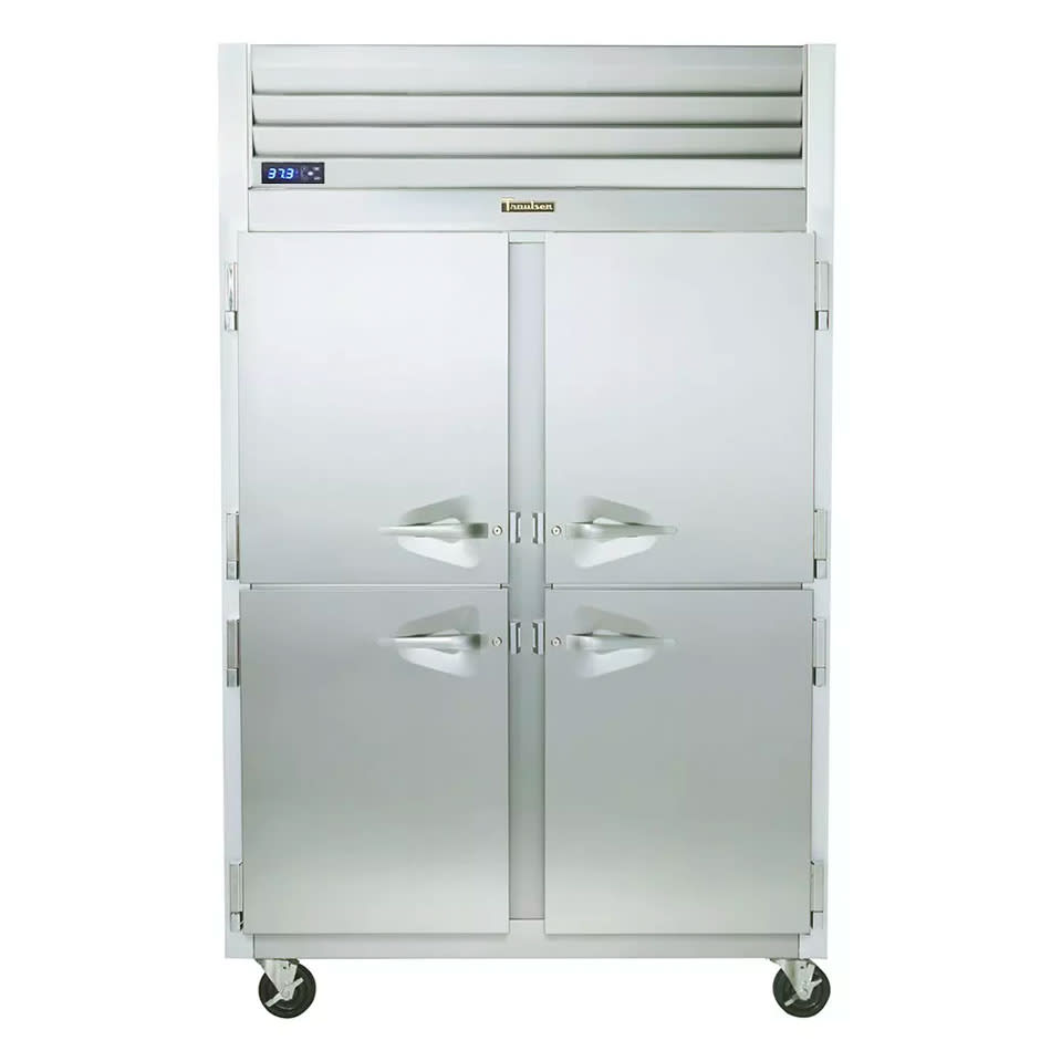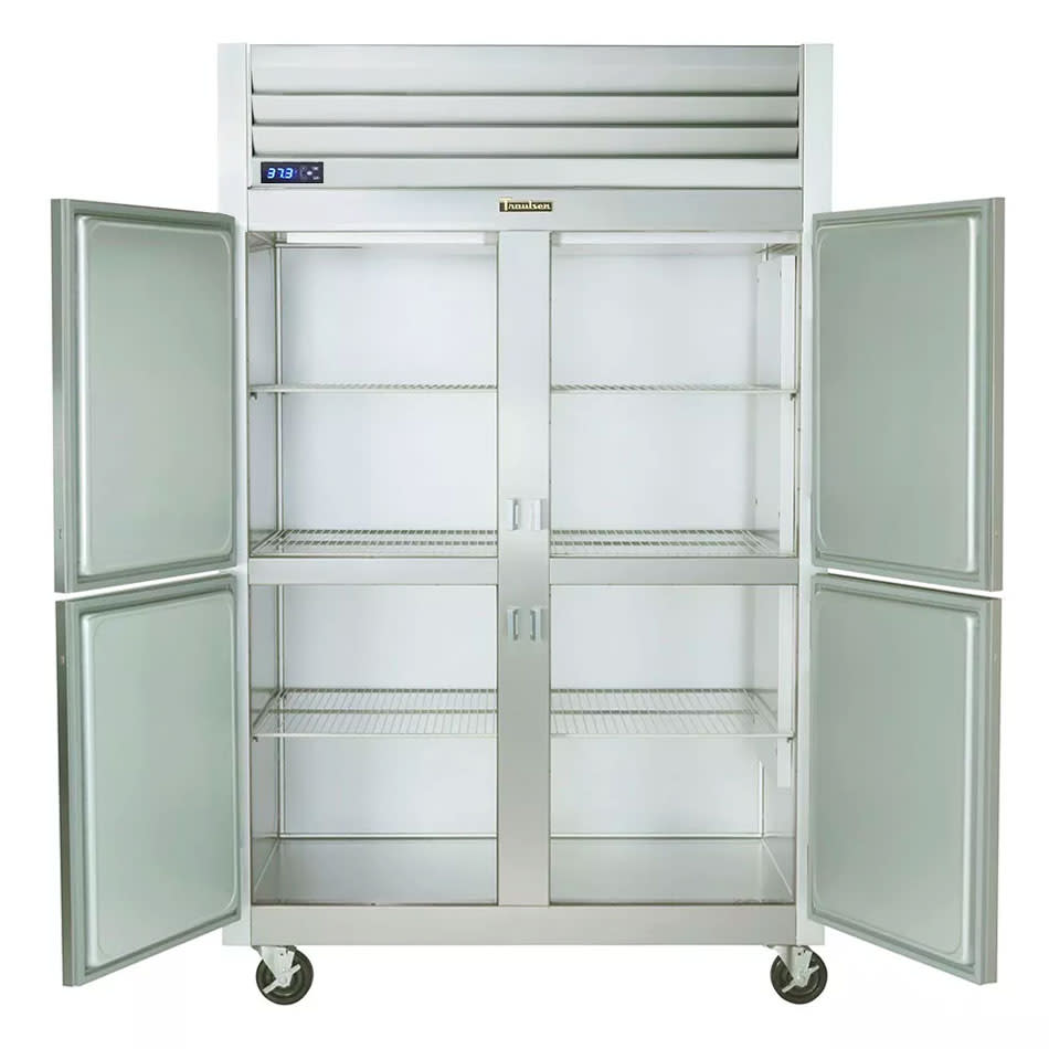 With doors on the front and back, the Traulsen G20004P pass-thru refrigerator can seamlessly connect the front and back of a restaurant. Kitchen staff can load items into the refrigerator while servers access the food from the other side. Food sits on sturdy wire shelves and a dent-resistant anodized aluminum floor. LED interior lighting illuminates stored items, so staff members can quickly find and retrieve what they need. The doors close by themselves before 120 degrees, so they are unlikely to be left ajar by accident.