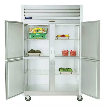 In order to hold frequently accessed items, this Traulsen G20004P two-section refrigerator has a thermostatic expansion valve. When the temperature rises above the set level, the valve expands, and refrigerant flow increases to quickly pull down the temperature. Staff members can adjust the temperature from 34 to 38 degrees Fahrenheit with the digital controller, and its LED display can show the temperature in Celsius or Fahrenheit for convenience.