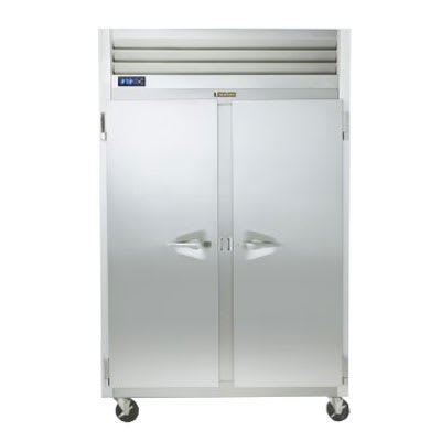 The Traulsen G20011 two-section reach-in refrigerator optimizes cold storage space for kitchens and comes with six shelves, each coated in epoxy to resist corrosion. Air circulation is promoted by the wire design, and the automatically activated LED lights provide maximum product visibility. The doors stay open past 120 degrees, and the self-closing design stops cold air from leaving the cabinet and compromising product safety.