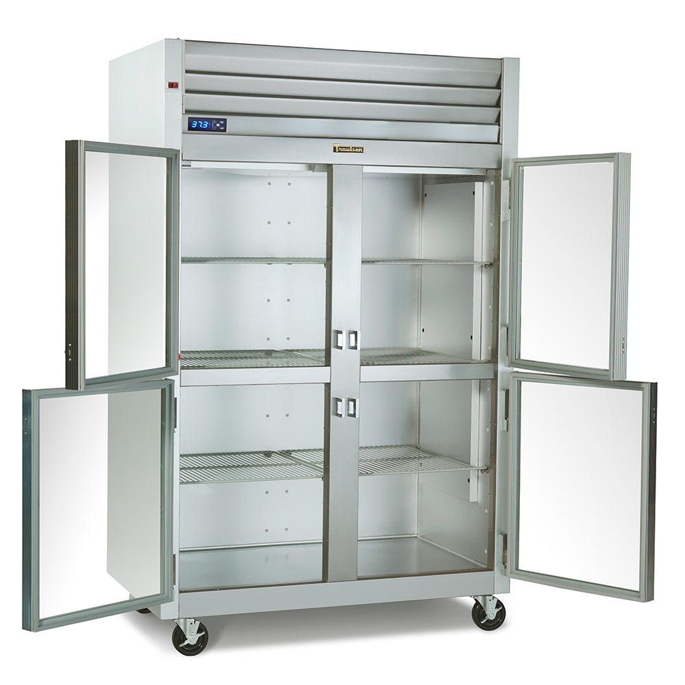 The doors on this Traulsen G21003 two-section commercial refrigerator are half height, so they split the door sections into smaller areas and reduce the amount of cold air that escapes when one is opened. These doors have glass windows, so users can see the stored items under LED lights. Because the doors self-close, they keep cold air in the cabinet, but they stay open at 120 degrees for convenient product stocking. The cabinet has three shelves in each section and a Load-Sure Guard that ensures product cannot block airflow along the walls.