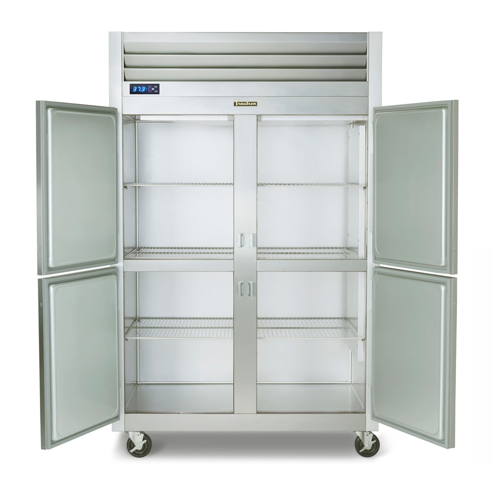 Equipped with a top-mounted condenser, this Traulsen G22000 two-section freezer produces temperatures at a designated level between -5 and 0 degrees Fahrenheit. However, it can also be programmed at -10 degrees Fahrenheit for products that need a deep chill. Cold temperatures are maintained by R-448A hydrocarbon refrigerant flow. Because the thermostatic expansion valve adjusts the flow rate depending on the current temperature, the interior can quickly return to its set level.