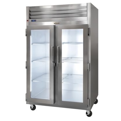 Between its two sections, the Traulsen G23010-053 two-section freezer offers a total of 46.9 cubic feet of cold storage space. The interior can be accessed through two full-height glass doors which are imbedded with LED lighting to improve product visibility. To simplify installation, this unit features a self-contained refrigeration system.