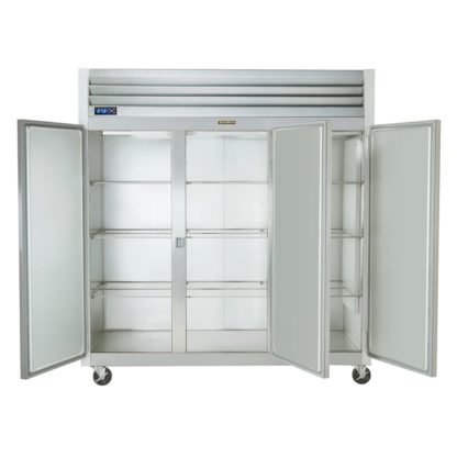 Dealer’s Choice Refrigerator, Reach-in, three-section, 69.3 cu. ft., top mounted self-contained refrigeration, (3) full-height solid doors (hinged left/left/right), (3) epoxy coated shelves per section (factory installed), microprocessor control with LED lights, LED interior lights, stainless steel front, anodized aluminum sides & interior, 6″ high casters, non-flammable R-450A refrigerant, 1/2 HP, cETLus, NSF, ENERGY STAR