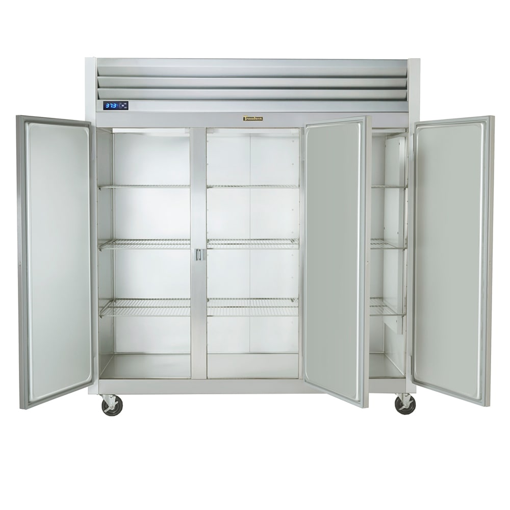 Because the Traulsen G31303 three-section freezer is positioned on casters, operators can permanently relocate the unit or wheel it away for cleaning. It cools with nonflammable R-448A refrigerant and a self-contained refrigeration system that’s simple to install. This unit’s temperature can be set from -10 to 0 degrees Fahrenheit using precise microprocessor controls and can be monitored via the LED display.