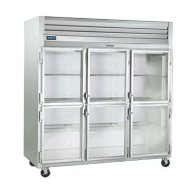 Dealer’s Choice Display Refrigerator, three-section, 70.1 cu. ft., top mounted self-contained refrigeration, (6) half-height glass doors (hinged left/right/right), (3) epoxy coated shelves per section (factory installed), microprocessor control with LED display, LED interior lights, stainless steel front, anodized aluminum sides & interior, 6″ high casters, non-flammable R-450A refrigerant, 3/4 HP, cETLus, NSF