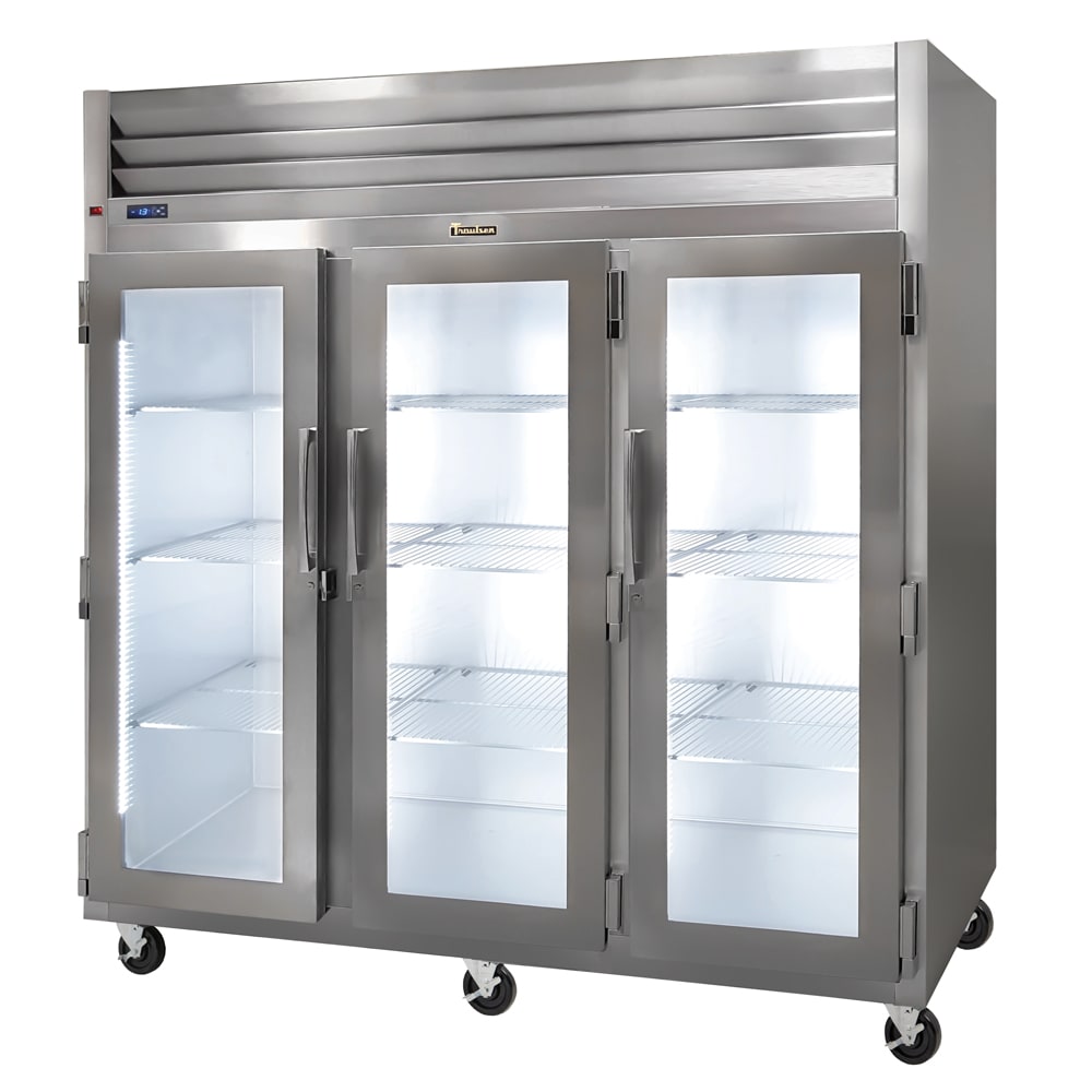 Dealer’s Choice Display Refrigerator, three-section, 70.7 cu. ft., top mounted self-contained refrigeration, (3) full-height glass doors (hinged left/right/right), (3) epoxy coated shelves per section (factory installed), microprocessor control with LED display, LED interior lights, stainless steel front, anodized aluminum sides & interior, 6″ high casters, non-flammable R-450A refrigerant, 3/4 HP, cETLus, NSF