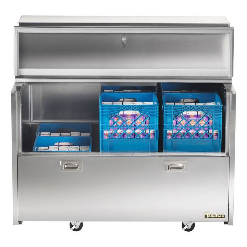 Spec-Line Forced-Air Single Access Milk Cooler, sliding door, holds (12) 13″x13″ crates or (8) 13″x19″ milk crates, stainless steel interior and exterior, reinforced floor, sliding caster rails , (3) heavy-duty stainless steel dunnage racks, top-mount refrigeration system, Santoprene E-Z clean gaskets, floor drain, 6″ factory mounted adjustable casters, 1/3 hp, cETLus, NSF, 115v/60Hz/1ph