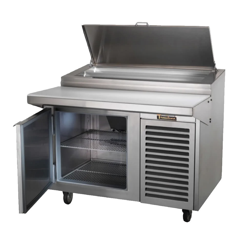 BLU 3-Row Glycol Prep Table, 46″ L, (1) door hinged L, 2″ stainless steel raised pan chiller, accepts (18) 1/6 size pans, 8″ cutting board, lift-off night cover, stainless steel front, ends & interior, galvanized back & bottom, (2) wire shelves/section, anodized T6 aluminum horizontal divider bars, self-contained refrigeration on right side, non-electric drain pan, 6″ casters, 1/3 HP, cETLus, NSF