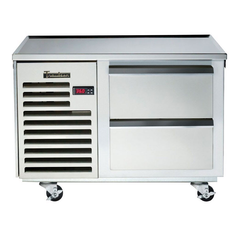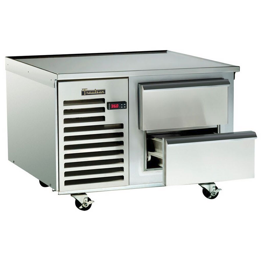Spec-Line Refrigerated Equipment Stand, 36″ long, (2) 12″ x 20″ x 6″ deep pan capacity, (2) drawers, self-contained refrigeration, microprocessor control, stainless steel marine top, stainless steel interior & exterior, 4″ casters, microprocessor controls, 1/3 hp, cULus, NSF, 115v/60/1ph