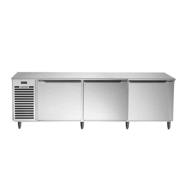 Spec-Line Undercounter Refrigerator, reach-in, three-section, 30.1 cu ft., side mount self-contained refrigeration, (3) solid hinged doors, (6) wire shelves, microprocessor control with LED display, stainless steel interior, front & sides, galvanized top, back & bottom, 6″ adjustable legs, non-flammable R-450A refrigerant, 1/3 HP, cULus, NSF