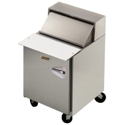 The Traulsen UPT3212-R Dealer’s Choice sandwich and salad prep table has a sturdy construction that can withstand heavy use. Its lid, front, sides, and door are all made of durable stainless steel, while the back and bottom are constructed of galvanized steel. Holding 12 sixth-size pans, the pan rail is reinforced and keeps ingredients in an upright position. Employees can move sandwiches or salads over the cutting board front with ease, reducing messes on top. For additional sauces and dressings, the pan lid lifts into a flat, shelf-like position.