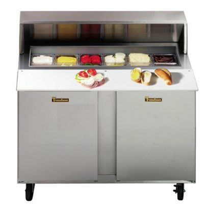 The Traulsen UPT4812-LR food prep table combines a prepping space with a refrigerated storage base underneath. It comes with 12 pans for the top compartment that are 4 inches deep, but it can accommodate pans as deep as 6 inches. Divider bars are included so that the unit can hold pans of different lengths and widths. To keep pans level and at safe temperatures, the unit features a pan ledge and a lid and cover assembly that insulates the pan area. The lid pivots open and closed for convenient access to prep ingredients. On the front, a cutting board runs the full width of the table so that salads and sandwiches can be moved through the prep station.
