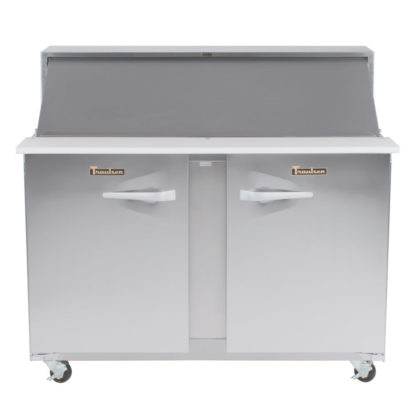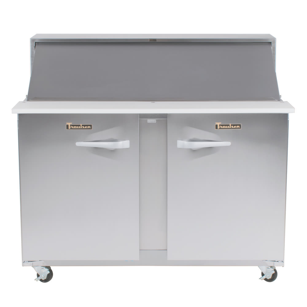 Accommodating 18 sixth-size food pans, the Traulsen UPT4818-LR prep table is ideal for sandwich and salad stations. The worktop surface includes a reversible, white nylon cutting board and a reinforced pan ledge to hold items securely. Each of the two self-closing doors is fitted with a sturdy work handle and include two powder-coated steel shelves inside. These doors have a 105-degree stay-open feature and include magnetic gaskets that can be removed and cleaned quickly.
