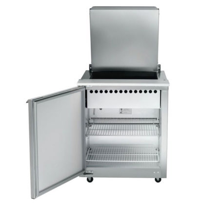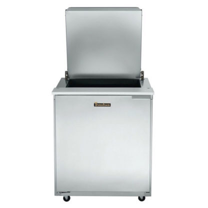 Dealer’s Choice Compact Prep Table Refrigerator with low-profile flat cover, Reach-in, one-section, 27″ wide, holds (6) 1/6 pans 4″ deep (included), can accommodate up to 6″ deep pans, full length white reversible cutting board, stainless steel exterior top, sides & door with Santoprene EZ-Clean Gasket, hinged right, anodized aluminum interior, galvanized exterior back and bottom, rear mounted, self-contained refrigeration, (4) 4″ casters, 1/4 HP, cETLus, NSF