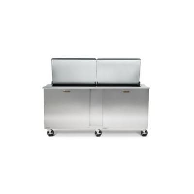 Dealer’s Choice Compact Prep Table Refrigerator with low-profile flat cover, Reach-in, two-section, 60″ wide, holds (24) 1/6 pans 4″ deep (included), can accommodate up to 6″ deep pans, stainless steel exterior top, sides & door with Santoprene EZ-Clean Gasket, hinged right/right, anodized aluminum interior, galvanized exterior back and bottom, rear mounted, self-contained refrigeration, R290 Hydrocarbon refrigerant, (6) 4″ casters, 1/4 HP, cETLus, NSF
