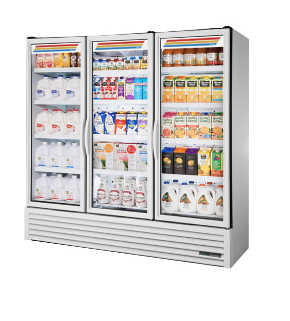 The True FLM-81~TSL01 three-section glass door merchandiser has a white powder-coated exterior finish that resists chipping and peeling. The corrosion-resistant aluminum interior has 12 cantilever shelves that adjust to a 15-degree angle in 5-degree increments. LED lights brighten the cabinet so customers can see products through the glass doors. These three doors close by themselves to prevent cold air from escaping, while the magnetic gaskets around the frame also prevent leaks.