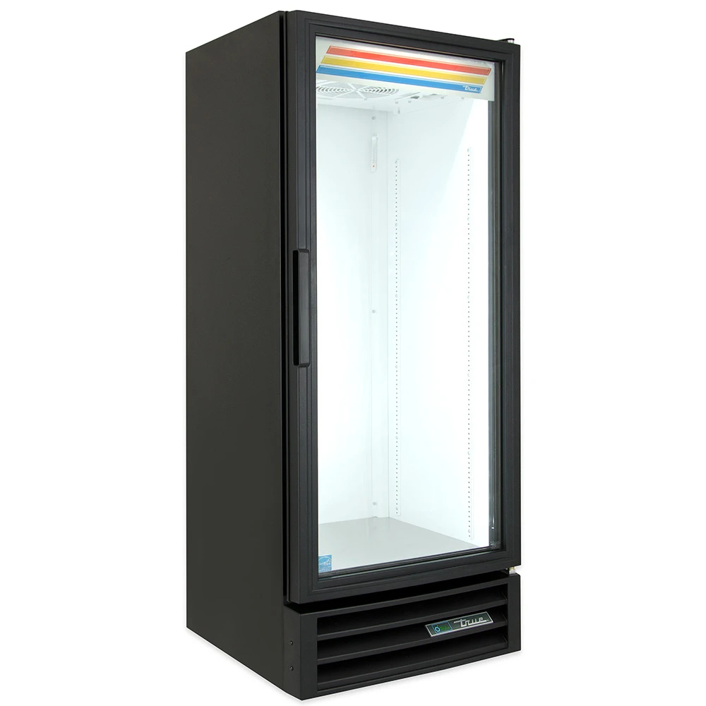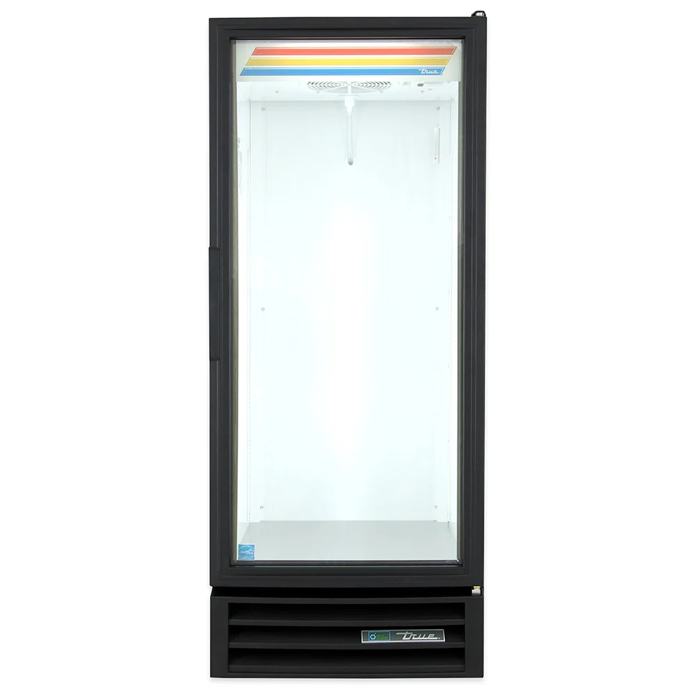 The True GDM-12-HC~TSL01 one-section glass door merchandiser has a white aluminum interior that brightens the cabinet. The stainless steel floor has a built-in drain that facilitates cleaning the interior. Foamed-in-place polyurethane insulation in the cabinet helps cold air stay inside and gives structure. The black powder-coated, heavy-duty steel frame rail is corrosion resistant and has leg levelers for uneven floor installation. A black powder-coated exterior hides dents and scratches well and resists peeling and chipping.