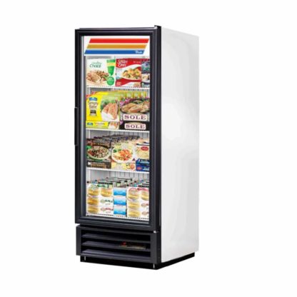 The True GDM-12F-HC~TSL01 one-section display freezer is perfect for holding frozen dinners, ice cream, and more. Temperatures are maintained at -10 degrees Fahrenheit by the evaporator coil, compressor, and condenser. These parts are bottom mounted, which keeps them in a convenient position for maintenance and cleaning. The cabinet eliminates ice buildup on the coil with an automatic defrost system that is time initiated and temperature terminated. The self-closing swinging door has a strong seal, torsion-type closure system that helps keep cold air inside the cabinet. Since it is triple paned and thermal insulated, the glass door keeps cold air inside while ensuring customers can view products. The magnetic door gasket keeps cold air from escaping and is removable for cleaning. A door sign decal is also included to merchandise stored product. The white powder-coated steel exterior does not chip or peel easily since it is permanent and durable to withstand constant use. Also heavy duty, the white aluminum interior liner has an easy-to-clean stainless steel floor. The unit comes with three shelves that are on adjustable 1⁄2-inch increments, so users can adjust them as needed to accommodate products that vary in size. The True GDM-12F-HC~TSL01 one-section display freezer is NSF-7 certified to store and display packaged and bottled product safely.