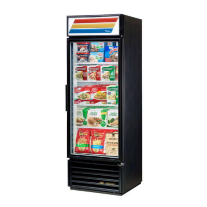The True GDM-19T-F-HC~TSL01 one-section glass door merchandiser has an automatic defrost system that is time initiated and temperature terminated to keep ice buildup off the evaporator coil. The self-contained capillary tube system uses R404A refrigerant to keep the operating temperature at -10 degrees Fahrenheit, which is ideal for frozen pizzas and dinners. The evaporator fan motors and large fan blades have a low-velocity, high-volume airflow, which produces quick pull-down time, fast temperature recovery, and cold holding temperatures.