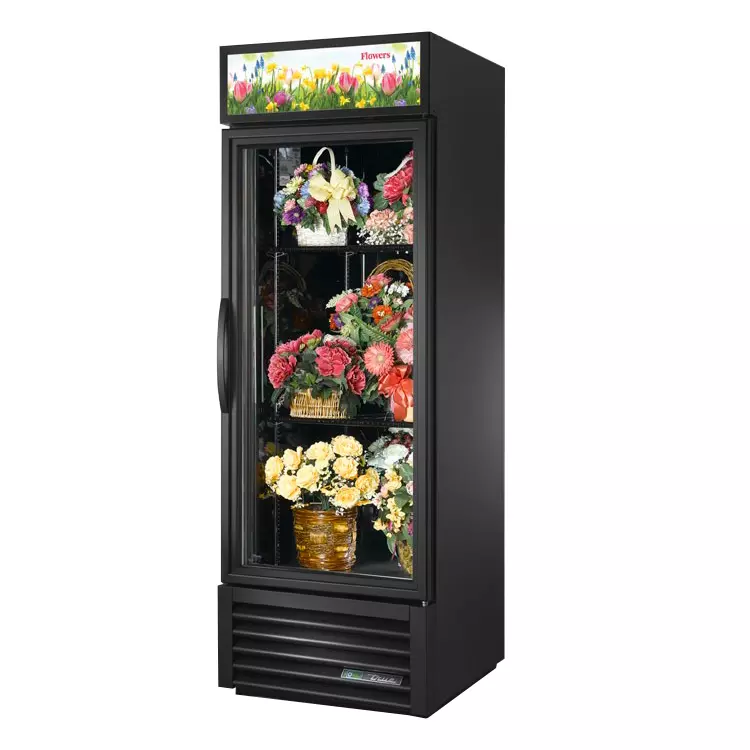 This True GDM-23FC-HC~TSL01 glass door floral case offers one section of cold storage at 35 degrees Fahrenheit and accommodates a variety of floral arrangements. It comes standard with a black laminated vinyl exterior that resists chipping and peeling and a black aluminum interior liner with a stainless steel floor. To hold displays, two adjustable shelves illuminated by interior LED lighting are included. This model is equipped with baffled airflow to provide even air distribution and keep flowers fresh.