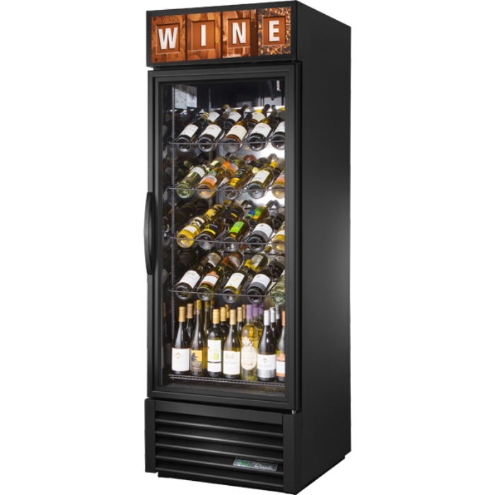 This True GDM-23W-HC~TSL01 refrigerated wine cooler has one section of cold storage that includes four adjustable wine racks and one adjustable wine shelf. Its double-pane glass door provides product visibility and is thermal insulated to keep cold air inside. To save energy, the door is self-closing, and a door lock by the 12-inch-long handle prevents theft. A magnetic gasket snaps into the frame and can be removed without tools. This wine cooler has a self-contained refrigeration system that maintains temperatures from 33 to 38 degrees Fahrenheit and a capillary tube system that controls the flow of R290 hydrocarbon refrigerant. Its bottom-mounted condenser supports quick maintenance access and raises merchandise to a comfortable height. Ensuring that the unit is not susceptible to corrosion, its evaporator is coated with epoxy. To efficiently move air, this cooler has an electronically commutated condenser and evaporator fan motors. The True GDM-23W-HC~TSL01 refrigerated wine merchandiser has a white laminated vinyl exterior that will not chip and peel. Its interior sides and top are made of black aluminum, and its floor is stainless steel. To enhance product presentation and keep wine chilled, it has a mirrored back wall and is foamed with polyurethane insulation. LED lighting illuminates the interior while an exterior sign panel lights up to attract customers.