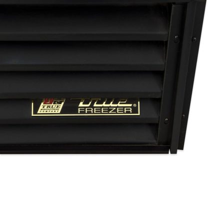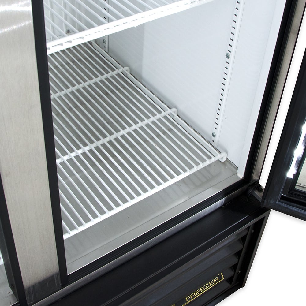 The True GDM-35F~TSL01 two-section glass door merchandiser uses environmentally friendly R404A refrigerant to keep temperatures cool. Its refrigeration system maintains an even temperature around -10 degrees, which is ideal for frozen dinners, waffles, and pizzas. Cold holding temperatures and fast recovery time are possible because the evaporator fan motor and larger fan blades create low-velocity, high-volume airflow. Built-up ice is melted with the automatic defrost system to ensure the cabinet runs properly, and the condensing unit is mounted on the bottom for maintenance and cleaning accessibility