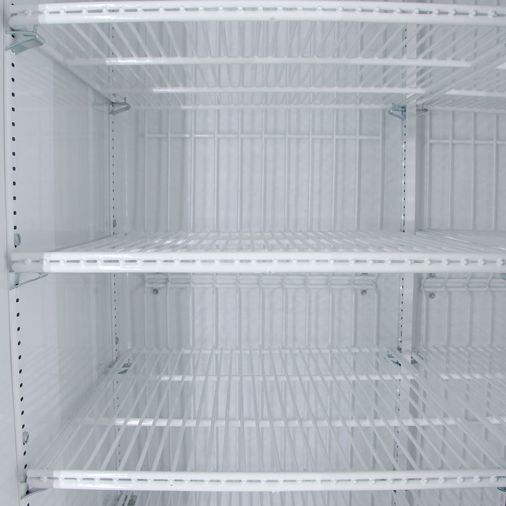A no-stoop lower shelf is created by the condensing unit to ensure product can be seen by customers. Eight heavy-duty, PVC-coated wire shelves are adjustable on 1⁄2-inch increments to accommodate products of varying heights. LED interior lights highlight products, while the triple-pane glass doors are transparent, so customers can make decisions before they open the door. Magnetic door gaskets help prevent cold air from escaping and are removable for cleaning and servicing. The True GDM-35F~TSL01 two-section glass door merchandiser is certified to hold packaged or bottled products.