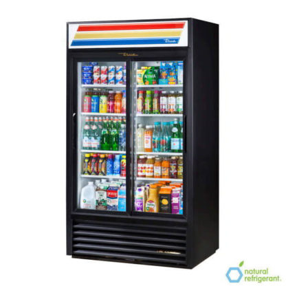 The True GDM-37-HC-LD two-section glass door merchandiser uses R290 hydrocarbon refrigerant to keep temperatures cool, while the refrigeration system maintains even temperatures from 33 to 38 degrees Fahrenheit. Less heat is produced and energy consumption is reduced since the condenser and evaporator motors push out more air than most standard systems. Since it is mounted on the bottom of the cabinet, maintaining the condensing unit is convenient. A black powder-coated exterior is durable and permanent, while the white aluminum interior liner resists peeling and chipping. Polyurethane insulation is foamed in place to give the cabinet rigidity and trap cold air.