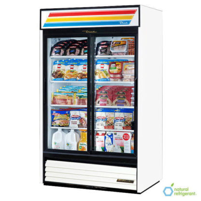 The True GDM-41-HC-LD two-section glass door merchandiser has evaporator and condenser fan motors that produce better airflow in the cabinet, minimizing heat production and energy consumption. To simplify maintenance, the condensing unit is mounted in the bottom of the cabinet, creating a lower shelf that increases product visibility. To protect the evaporator from corrosion, it is epoxy-coated, while the refrigeration system uses R290 hydrocarbon refrigerant to keep temperatures cool from 33 to 38 degrees Fahrenheit.