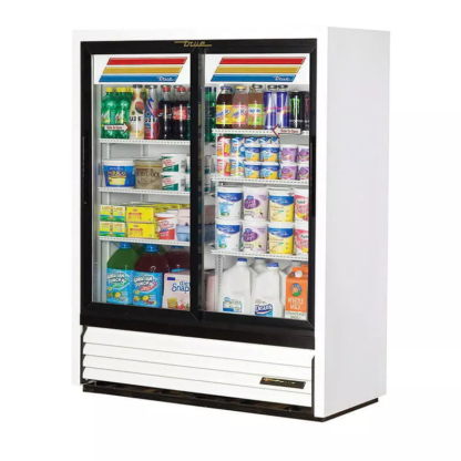 The True GDM-41SL-60-HC-LD two-section glass door merchandiser ensures customers can see packaged products with LED interior lights and a bright white aluminum interior liner. Double-pane, thermal-insulated glass doors will not become foggy so products are still visible, and a 12-inch handle eases loading and unloading merchandise. Cold air stays in the cabinet since the doors close on their own. In the cabinet, six heavy-duty, PVC-coated wire shelves are adjustable to adapt to varying product height, and each shelf includes four chrome-plated clips and aluminum shelf supports.