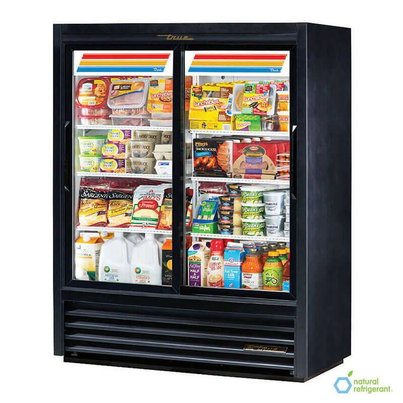Since the black powder-coated exterior is permanent, it will not peel or chip. A black powder-coated steel frame rail prevents corrosion and has attached leg levelers to help with uneven floor installations. Cold air is retained in the cabinet through foamed-in-place, polyurethane insulation. Environmentally friendly R290 hydrocarbon refrigerant is used to keep temperatures from 33 to 38 degrees Fahrenheit in the True GDM-41SL-60-HC-LD two-section glass door merchandiser.