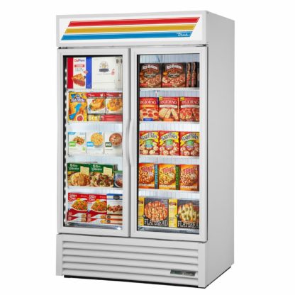 The True GDM-43-HC~TSL01 two-section glass door merchandiser uses environmentally friendly R290 refrigerant to keep temperatures cool. Its high-capacity, balanced refrigeration system maintains even temperatures between 33 and 38 degrees Fahrenheit for optimal food preservation. Heat production and energy consumption are cut since the condenser and evaporator fan motors move a consistent volume of air. The condensing unit is mounted on the bottom of the cabinet for convenient component access—this design creates a no-stoop floor shelf that slightly raises products so they are visible. In the cabinet, eight heavy-duty, PVC-coated wire shelves hold products of all heights since they are adjustable in 1⁄2-inch increments. The LED interior lights ensure products more visible than they would be under fluorescent lights, and products can be seen clearly through the double-pane, thermal-insulated glass doors. A 12-inch-long extruded handle on the door aids staff in opening it to grab or load merchandise. Cold air is kept from escaping by magnetic door gaskets that can be removed for cleaning or replacement. Foamed-in-place polyurethane insulation traps cold air inside the True GDM-43-HC~TSL01 two-section glass door merchandiser.
