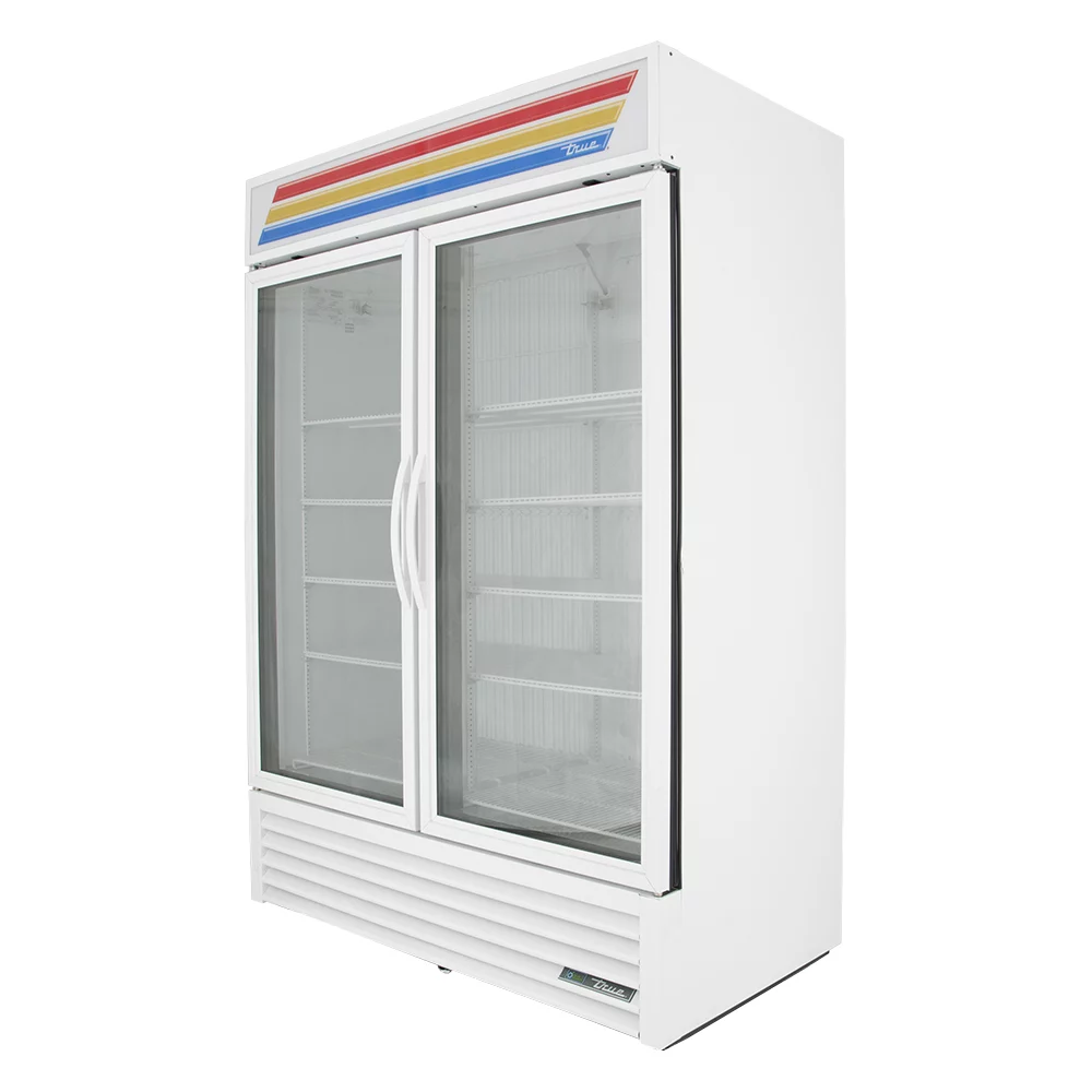 The True GDM-49F-HC~TSL01 two-section freezer merchandiser has a non-peeling, non-chipping White powder-coated exterior. This freezer display merchandiser’s colorful, illuminated sign panel catches customer attention, increasing impulse sales of packaged frozen dinners and other convenience foods. Sturdy, aluminum frames support triple-pane glass doors with easy-grip handles and a self-closing feature. Magnetic door gaskets help maintain a constant -10 degrees Fahrenheit to keep frozen food and ice cream solid.