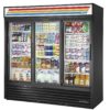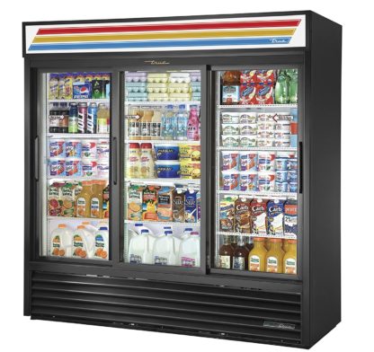 The True GDM-69-HC-LD three-section glass door merchandiser offers high-quality construction and energy-efficient design. With its 12 shelves and three energy efficient doors, there is plenty of storage space for a variety of merchandise. This refrigerated merchandiser has an oversized, factory-balanced refrigeration system for longer life, fast pull-down and recovery times, and cold holding temperatures. More eco-friendly than traditional options, this unit uses R290 hydrocarbon refrigerant. The black exterior is made of durable, powder-coated steel, while the interior is constructed of aluminum with a stainless steel floor, both of which are durable and ease cleaning. A conveniently placed drain simplifies the cleaning process, and LED interior lighting illuminates the cabinet interior so customers can see products. An extra-large evaporator coil, along with high horsepower compressor and large condenser, maintains temperatures of 33 to 38 degrees Fahrenheit in the True GDM-69-HC-LD three-section glass door merchandiser.