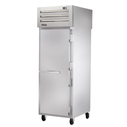 This True STA1FPT-1S-1S one-section pass-thru freezer has a stainless steel exterior, interior ceiling, and interior floor, all of which resist corrosion. Its interior sides and back are made of aluminum to resist dents and scratches. Ecomate, a type of polyurethane insulation, is foamed into the walls to retain cold air. This freezer has a top-mounted system that is kept away from floor debris and a self-contained capillary tube system that controls the flow of R404A refrigerant. Its factory-balanced system keeps contents around -10 degrees Fahrenheit. Beginning operation automatically at a set time, the defrost system stops on its own once an appropriate temperature is reached. The evaporator and condenser fan motors are electronically commutated, so they use little energy and create little heat when circulating air.
