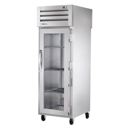 This True STA1R-1G-HC one-section reach-in refrigerator is made of stainless steel and aluminum, both of which resist dents and facilitate cleaning. Its walls are foamed with polyurethane insulation to retain temperatures, and three interior PVC-coated wire shelves support product. To aid in moving the unit, four 5-inch-diameter castors are set in place, with a locking front set for stability. Its interior is brightened with LED lights, so product is highly visible. Internal temperatures are displayed externally in Fahrenheit or Celsius.