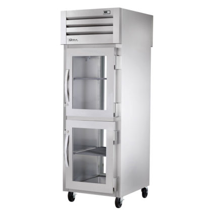 The True STA1RPT-2HG-1G-HC one-section pass-thru refrigerator has a self-contained capillary tube system that holds and regulates the flow of R290 hydrocarbon refrigerant. Its condenser and evaporator fan motors are electronically commutated, so they move air efficiently without using a lot of energy or creating a lot of heat. To resist corrosion and remain separated from floor debris, the evaporator is epoxy coated and mounted on top of the unit. This unit maintains steady temperatures in a range of 33 to 38 degrees Fahrenheit, and the user can set the temperature with electronic controls.