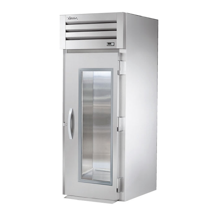 The True STA1RRI-1G Spec Series roll-in refrigerator keeps its contents between 33 and 38 degrees Fahrenheit with its capillary tube refrigeration system. Environmentally friendly R134A refrigerant runs through the tubes, ensuring the cabinet stays cool. In order to move large amounts of air at once, the evaporator fan self-lubricates and uses large fan blades. This design enables the refrigerator to reach cold temperatures quickly. A digital display on the exterior shows the internal temperature.