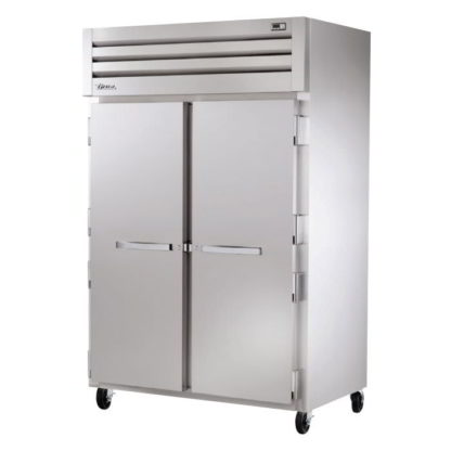 Maintaining a steady temperature ranging from 140 to 180 degrees Fahrenheit, this True STA2H-2S Spec Series® reach-in mobile heated cabinet is designed to keep cooked and baked food warm. It is constructed of stainless steel and aluminum for corrosion and dent resistance, and its walls are insulated with polyurethane foam for durability. To generate heat, a stainless steel heating element is built in. Low-velocity fans consistently circulate warm air, and the cabinet’s top vent can be opened or closed to control humidity levels. Three interior chrome-plated wire shelves hold product. Aiding in installation, three feed wires are included for hardwiring.