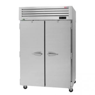 The True STA2RRI-2S Spec Series two-section roll-in refrigerator has two stainless steel ramps that withstand heavy loads. Roll-in racks as large as 27 inches wide by 29 inches deep by 66 inches tall fit in the cabinet, and bumpers line the aluminum walls to minimize dents and scratches from racks. Its stainless steel floor is quick to wipe down, while its stainless steel exterior is heavy duty. To protect product from unauthorized access, both doors have bolt-style locks, and they stay open past 120 degrees to facilitate loading and unloading.