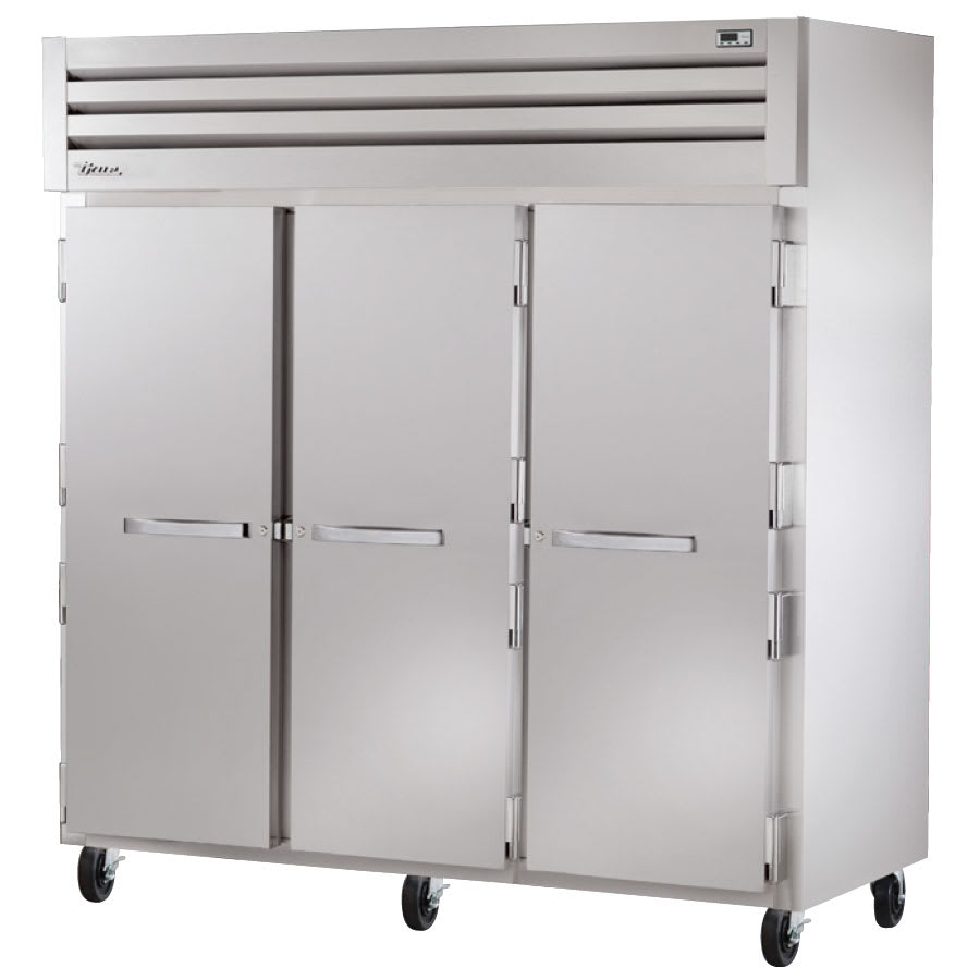 Temperatures in the True STA3F-3S three-section reach-in freezer stay at -10 degrees Fahrenheit with R404A refrigerant, and operators can check the temperature on the exterior display, which can be shown in Fahrenheit or Celsius. The refrigeration system is top mounted, away from dirt and debris on the floor, while its electrically commutated evaporator and condenser fan motors consistently move air with less heat production and energy consumption than other systems. Defrost cycles in the freezer remove ice buildup to keep the system operating efficiently. These cycles are automatic, starting on a timer and ending when the temperature is at an ideal level.