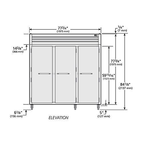 SPEC SERIES® Freezer, reach-in, three-section, -10°F, (3) stainless steel doors with locks, cam-lift hinges, digital temperature control, (9) chrome shelves, LED interior lights, stainless steel front & sides, aluminum interior, 5″ castors, 2-3/4 HP, 208-230v/60/1-ph, 8.3 amps, NEMA 6-15P, cULus, UL EPH Classified, Made in USA