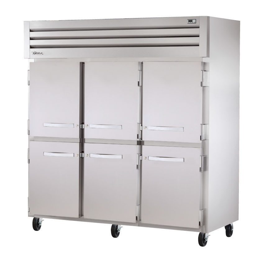 SPEC SERIES® Freezer, reach-in, three-section, -10°F, (6) stainless steel half doors with locks, cam-lift hinges, digital temperature control, (9) chrome shelves, LED interior lights, stainless steel front & sides, aluminum interior, 5″ castors, 2-3/4 HP, 208-230v/60/1-ph, 8.3 amps, NEMA 6-15P, cULus, UL EPH Classified, Made in USA