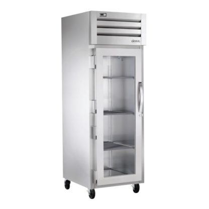 The True STG1F-1G-HC one-section reach-in freezer includes three wire shelves that are PVC coated to provide corrosion resistance and durability. To support high-volume use and prevent rusting, the unit is made of aluminum and stainless steel. Foamed-in-place insulation traps cold air, and an LED interior light shines on the stored items to ensure visibility.